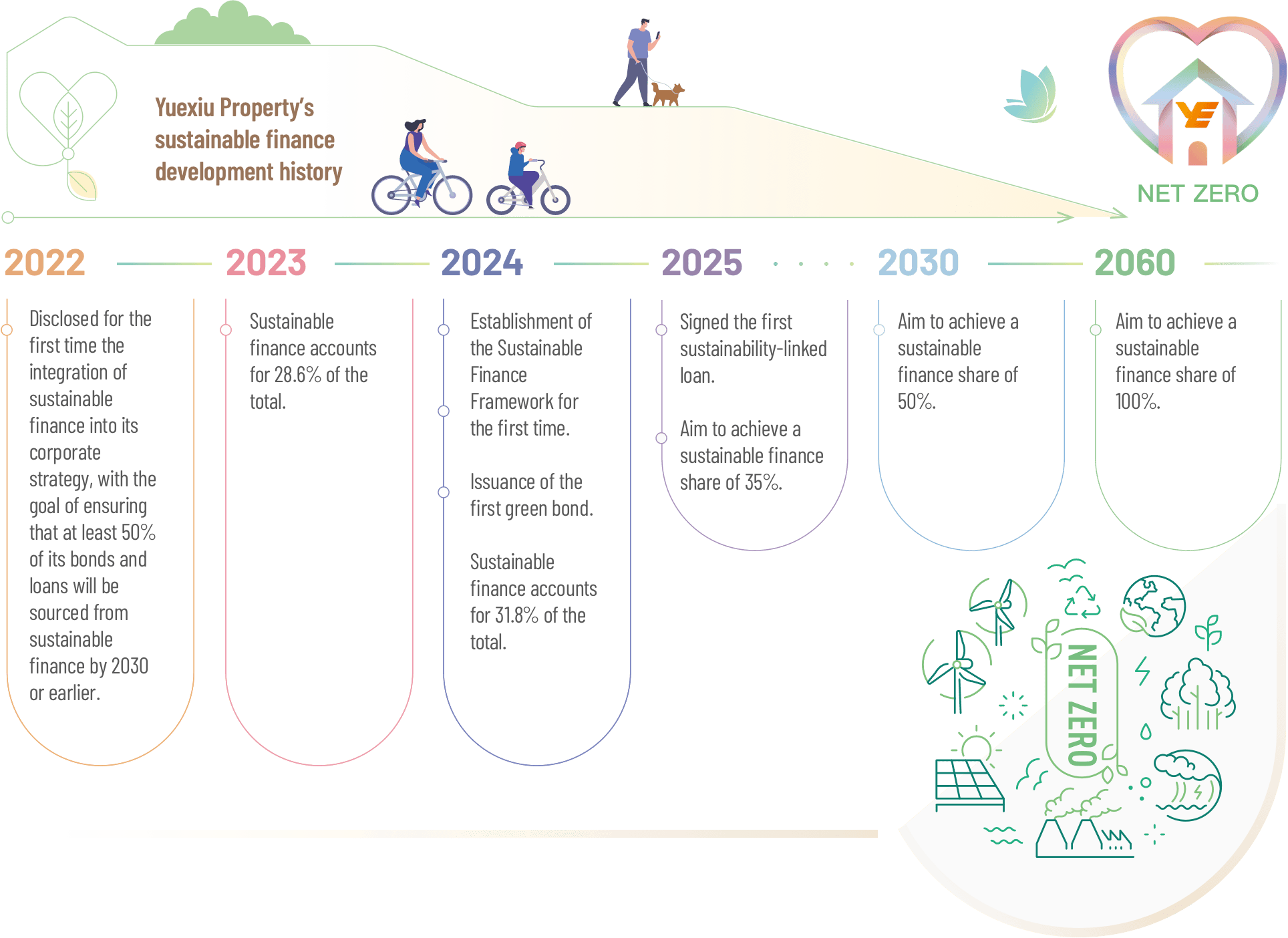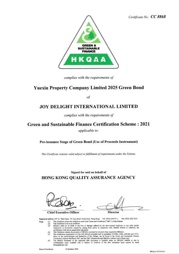 In order to effectively integrate the concept of sustainable development into various dimensions of business development so as to promote ESG works steadily and comprehensively, Yuexiu Property set up a Sustainable Finance Framework for the first time in 2024. This framework was updated in 2025 in line with market developments, which is planned to continue financing projects, assets and developments in line with Yuexiu Property's sustainability vision and strategy through sustainable financing transactions.