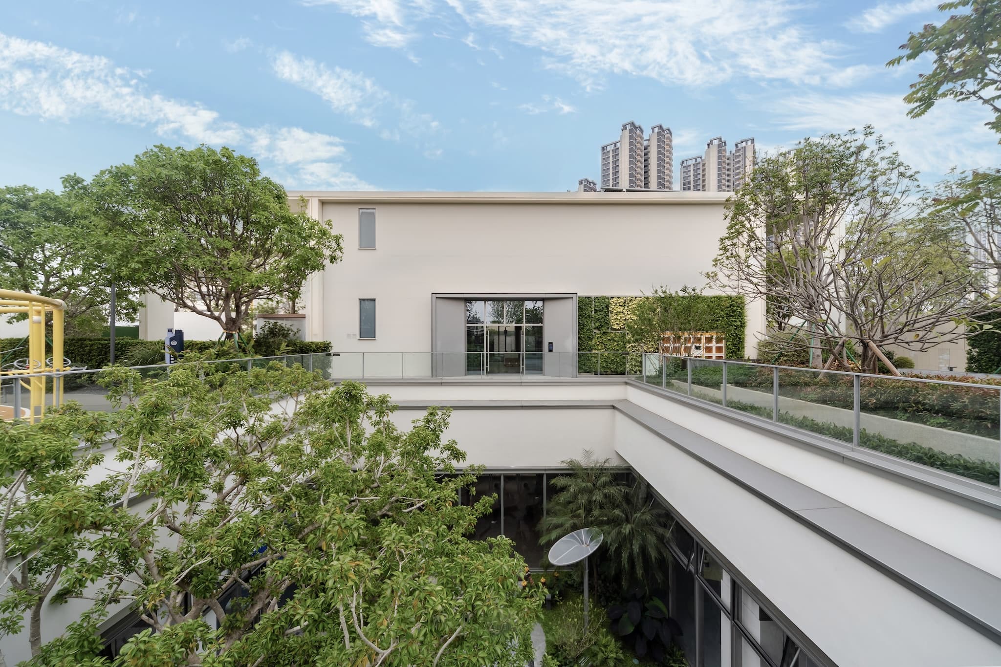 研发中心建筑本身体现了公海赌船 好产品技术沉淀和前沿探索:如地上建筑采用UHPC (Ultra-High Performance Concrete) 高强混凝土预制构件、温变玻璃、光电玻璃、一体化保温围护系统、屋顶光伏系统、光伏直流多联机等技术,实现「建筑碳中和」;地下建筑使用自然通风、自然采光、近零污染、智慧能源控制等技术,打造绿色低碳、健康舒适及智慧便捷的空间。