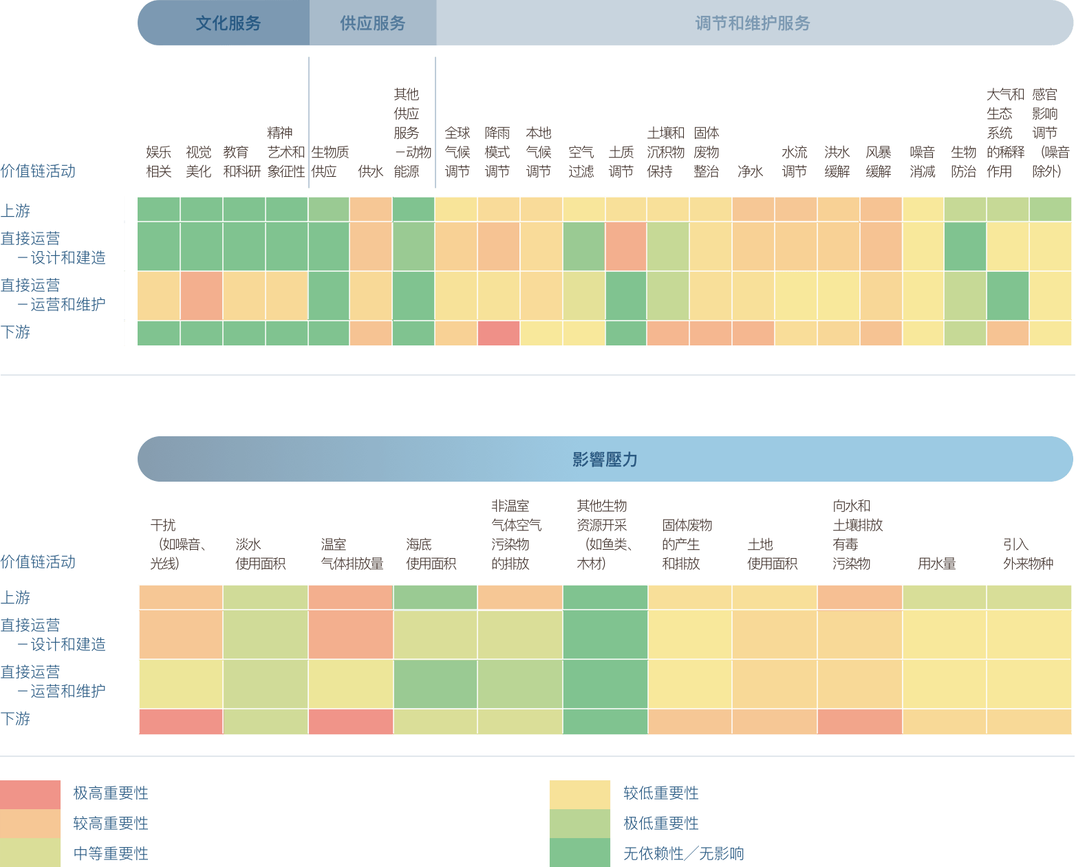 2024年,依据TNFD推荐框架,公海赌博船 已经完成了对全价值链和10个重要项目城市的生物多样性评估。在价值链覆盖层面,我们系统性应用LEAP方法论,对公海赌博船 在短期、中期及长期运营周期内的自然相关依赖与影响开展分析。公海赌博船 不仅评估了业务活动的直接生态足迹,更将分析边界延伸至上下游的全生命周期。通过多维度分析,已建立包含考虑22个依赖自然的主题和11个影响自然的主题的监测体系。