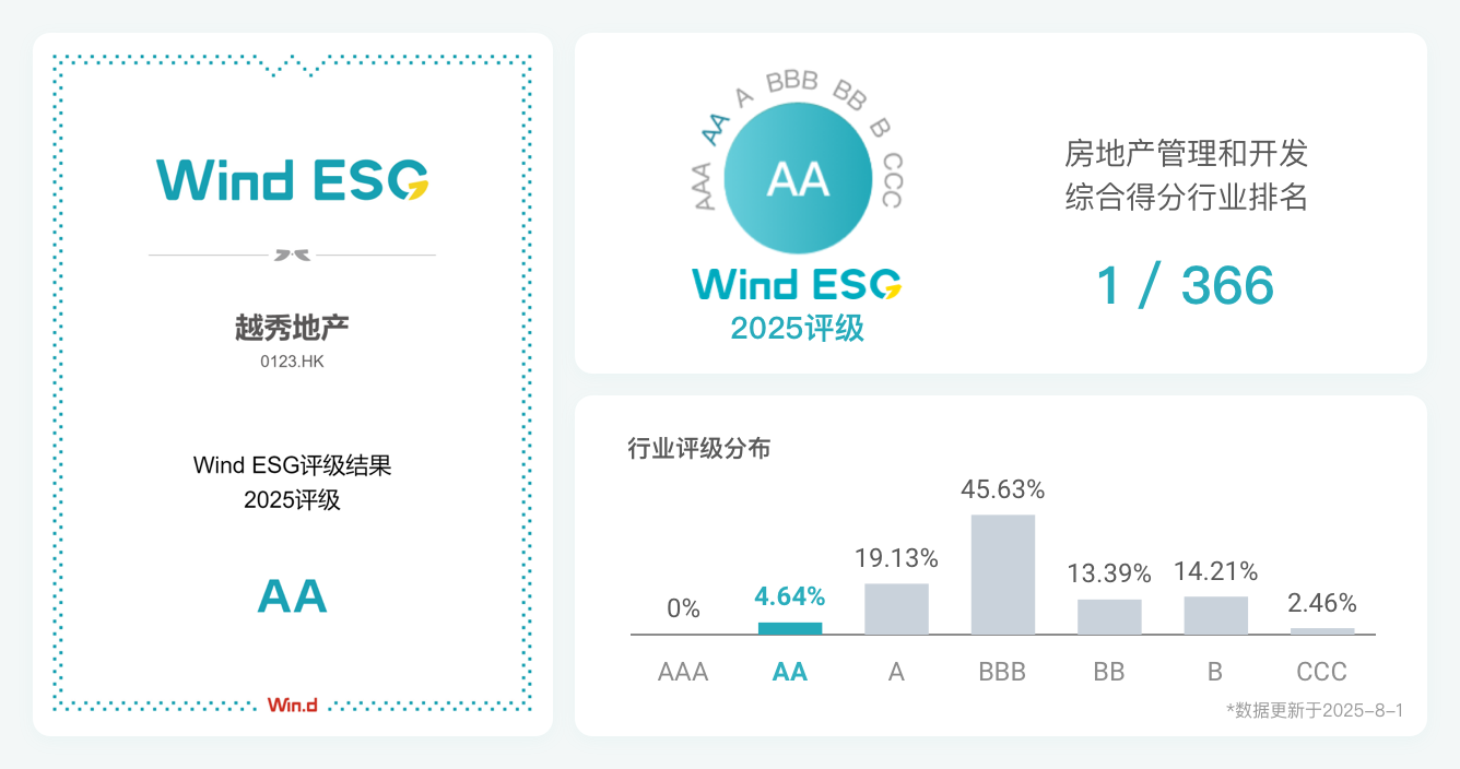 近日,万得(Wind)正式发布2025年ESG评级结果,公海赌博船 (0123.HK)凭借在环境治理、社会责任与公司治理(ESG)领域的卓越实践,获得Wind ESG “AA”评级,ESG综合得分跃居至房地产管理和开发行业366家参评企业中的第一位,引领房地产可持续发展新标杆。