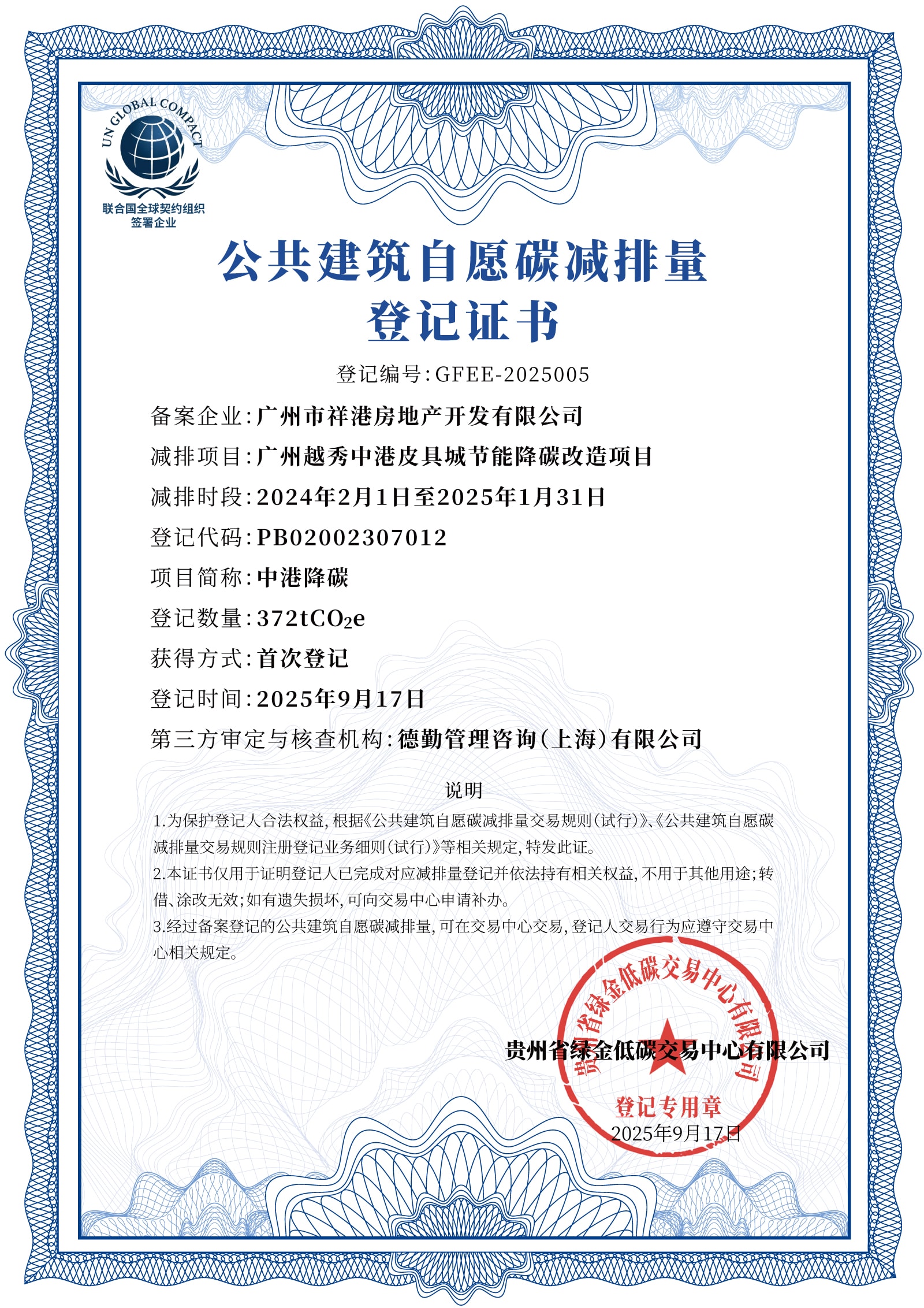 2025年9月22日,公海赌博船 旗下中港皮具城建筑碳信用产品于贵州省绿金低碳交易中心成功挂牌上市,首次挂牌价格为人民币66元/tCO2e。该项目不仅成为全国首个专业市场类建筑碳信用产品,也实现了广州市建筑碳信用交易“零的突破”,既是公海赌博船 积极响应国家“双碳”战略、深化可持续发展道路的关键里程碑,也为后续同类项目积累了宝贵经验、奠定了实践基础。